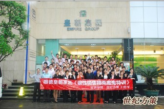 世紀方策董事會首席講師王建偉老師受順德皇朝家私盛情邀請,本次培訓(xùn)針對公司銷售主任及銷售經(jīng)理?;食宜郊瘓F, 雄踞于全國最大的家私批發(fā)集散地、中國家具商貿(mào)之都——樂從之中軸中央,是中國率先經(jīng)營歐美各國原裝頂級豪華家私、飾品以及國內(nèi)眾多知名品牌家私的王牌經(jīng)銷商。